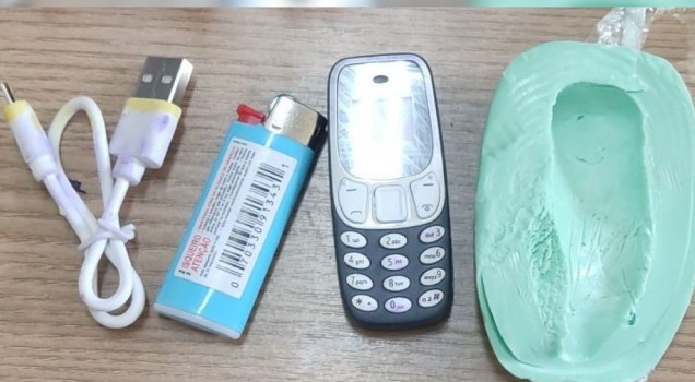 Dois advogados de 22 e 24 anos são suspeitos d tentar passar para um preso um celular, um cabo UBS e um isqueiro escondidos dentro de um sabonete, em Planaltina de Goiás, no Entorno do Distrito Federal. Foto mostra um buraco feito no produto para colocar os itens.