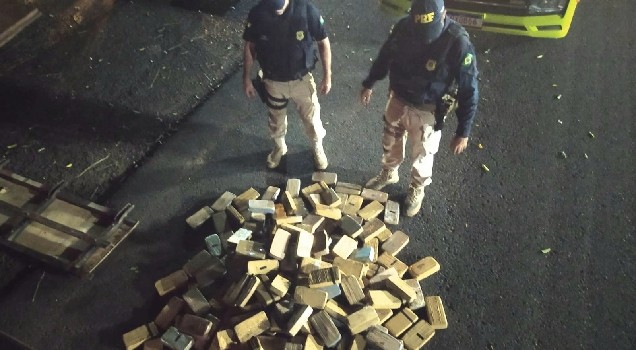 Por volta das 19h30, policiais rodoviários federais pararam um caminhão que fazia um trajeto suspeito e, durante a vistoria, localizaram 186 tabletes de pasta base de cocaína, matéria-prima para a produção da droga em pó, forma como é consumida. A droga estava escondida sob o assoalho da carroceria do caminhão.