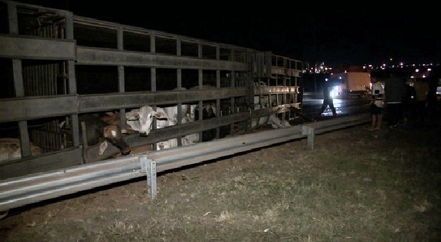 O condutor teve ferimentos leves e recusou atendimento médico. Parte dos animais transportados escapou.