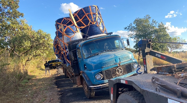 O caminhão foi removido ao pátio sob escolta e só será liberado apos regularização da carga e dos equipamentos obrigatórios.