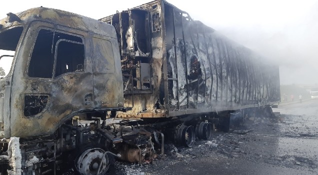 Carreta pega fogo e carga de frangos vira ‘churrasco’ na BR 050