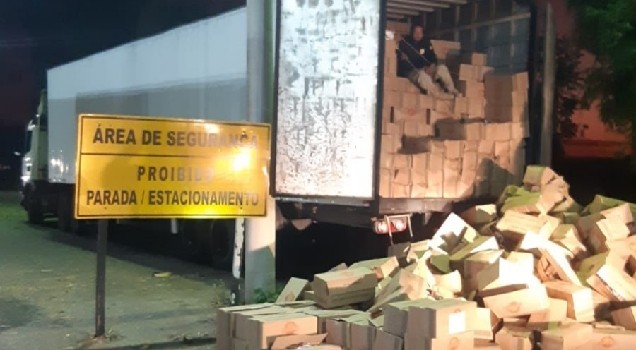 Os condutores apresentaram nota fiscal emitida por uma empresa de produtos de limpeza e os cigarros estavam ocultos atrás de uma carga de alimentos_