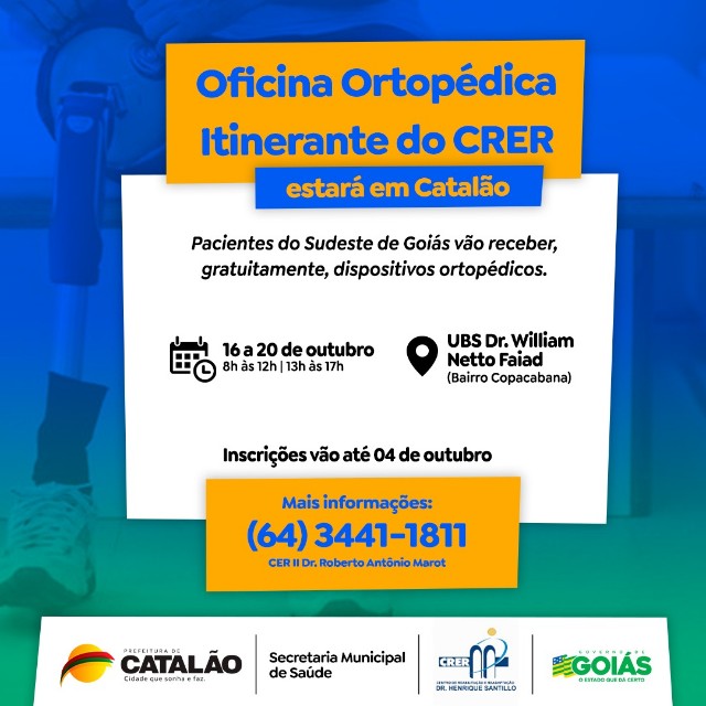 O município de Catalão receberá entre os dias 16 e 20 de outubro, o atendimento da Oficina Ortopédica Itinerante do CRER, com o objetivo de atender pacientes portadores de necessidades especiais, que necessitam de órteses, próteses, coletes, calçados e palmilhas ortopédicas, gratuitamente.