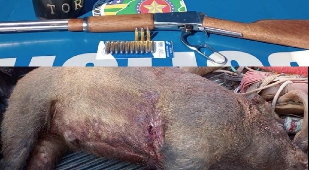 Durante a abordagem, conforme preconiza o Procedimento Operacional Padrão, ao realizar as buscas pessoal e veicular, foi encontrado no interior do veículo, 01 (uma) arma de fogo, tipo Carabina, calibre 38, com 13 (treze) munições calibre 38 intactas e um animal silvestre, javali.