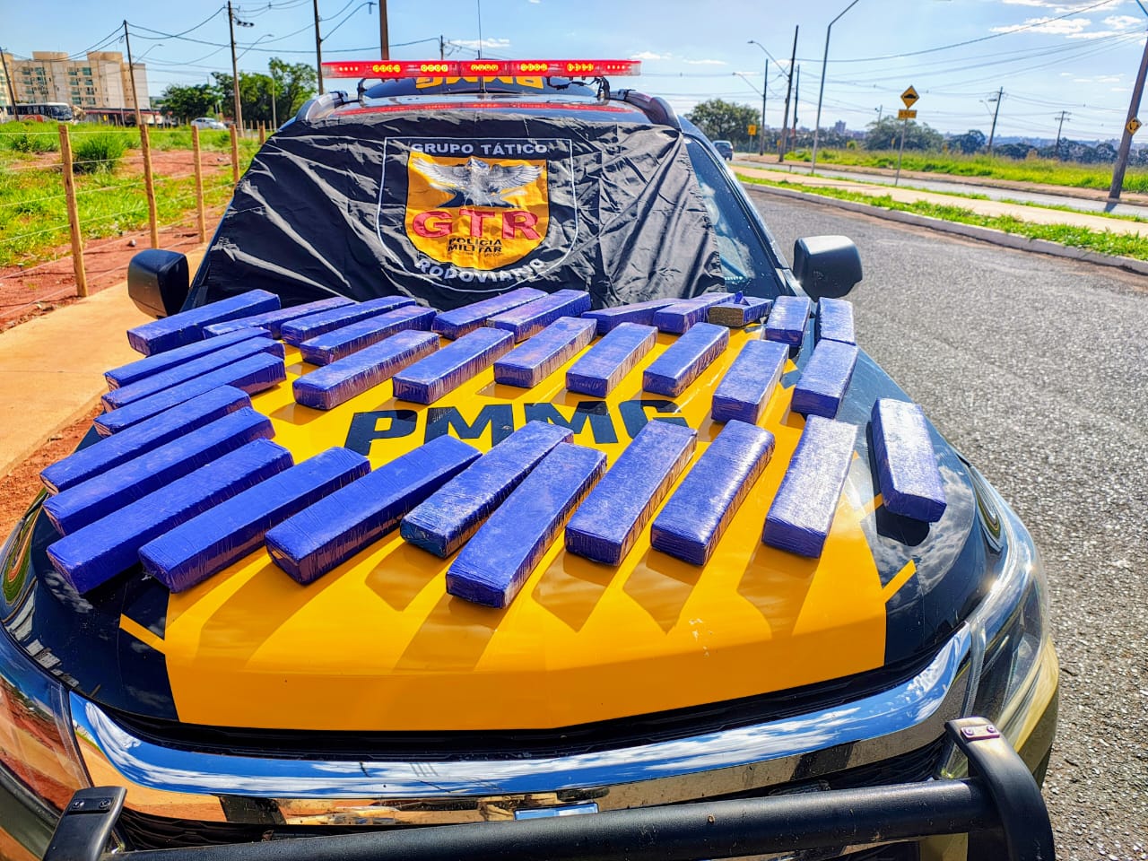 O condutor, de 26 anos, e a passageira de 31 anos, foram abordados. Segundo a polícia, havia um forte cheiro de maconha vindo do interior do veículo. Durante a busca, os militares encontraram no porta-malas 32 barras grandes de substância esverdeada com características de Cannabis sativa, embaladas em sacos plásticos brancos e fita azul.