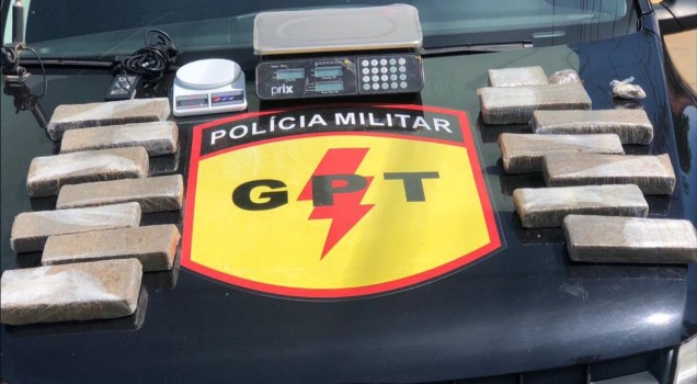 Durante diligências, após denúncia anônima, foram apreendidas aproximadamente 14 grandes peças de entorpecente “maconha”, além de duas balanças de precisão.