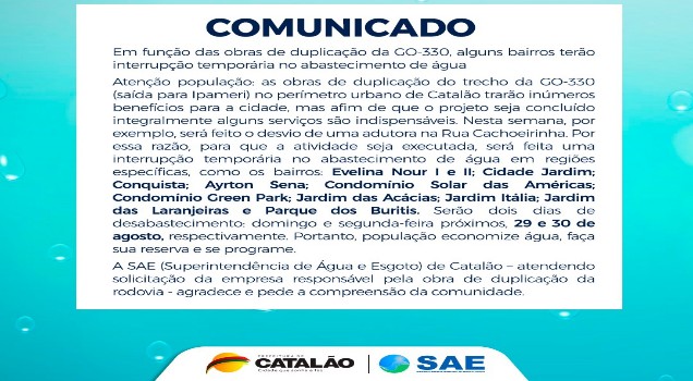 A SAE (Superintendência de Água e Esgoto) de Catalão – atendendo solicitação da empresa responsável pela obra de duplicação da rodovia – agradece e pede a compreensão da comunidade.