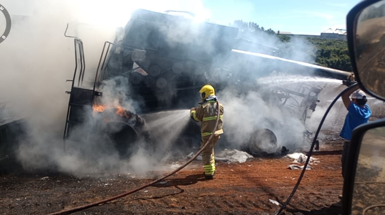 Homens do Corpo de Bombeiros, da própria concessionária e os funcionários da propriedade combatem o fogo com a utilização de pelo menos 08 caminhões-pipa.