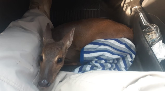 A Polícia Rodoviária Federal (PRF) resgatou, na tarde deste sábado (28), um veado-catingueiro que estava ferido, às margens da BR-060, próximo ao município de Guapó, região central de Goiás.