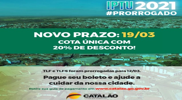 De acordo com a administração municipal, as datas foram prorrogadas em razão da pandemia da covid-19, considerando que Catalão ficou uma semana com suas atividades não essenciais suspensas (inclusive, o Poder Público Municipal, para atendimento ao público) e, em função disso, levando-se em consideração também que não seria prudente manter a data de vencimento dos tributos municipais, depois do fechamento mencionado e, para evitar aglomeração de contribuintes. Contudo, a dilatação no prazo está regulamentada conforme Decreto nº 271, de 02 de Março de 2021.